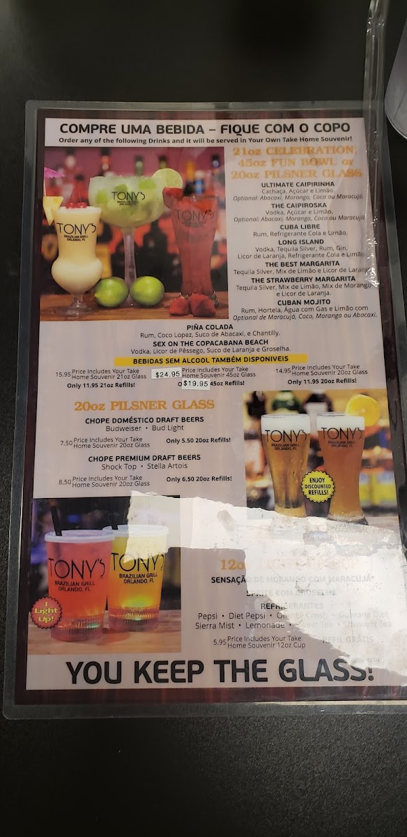 Introducing the menu at Tony's Brazilian Grill, located at 5159 International Drive, Orlando, FL, is a culinary journey that reflects the vibrant flavors of Brazil. Guests can indulge in a delightful Brazilian buffet featuring a rotating selection of meats, salads, and signature dishes, ensuring something for everyone.